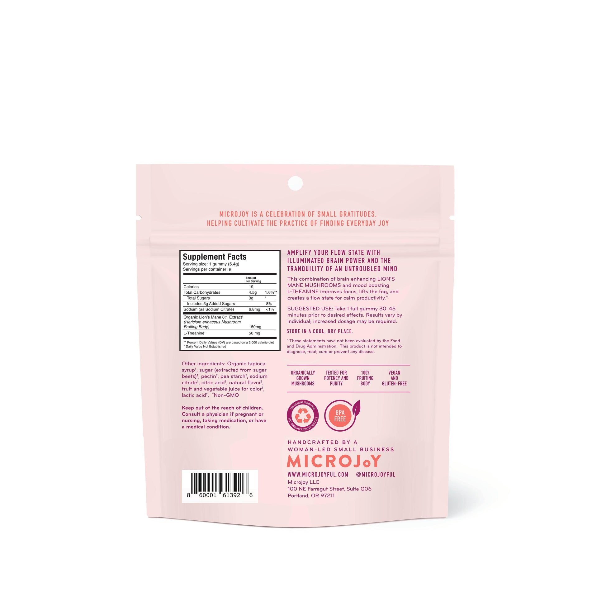Lift the fog and invite clear skies into the day. This combination of Lion's Mane mushrooms and L-Theanine cultivate brain acuity, concentration, improved mood and general flow for calm and productivity. Lemon flavor, 5 gummies per resealable package. Vegan / Handmade / No fake flavors or colors