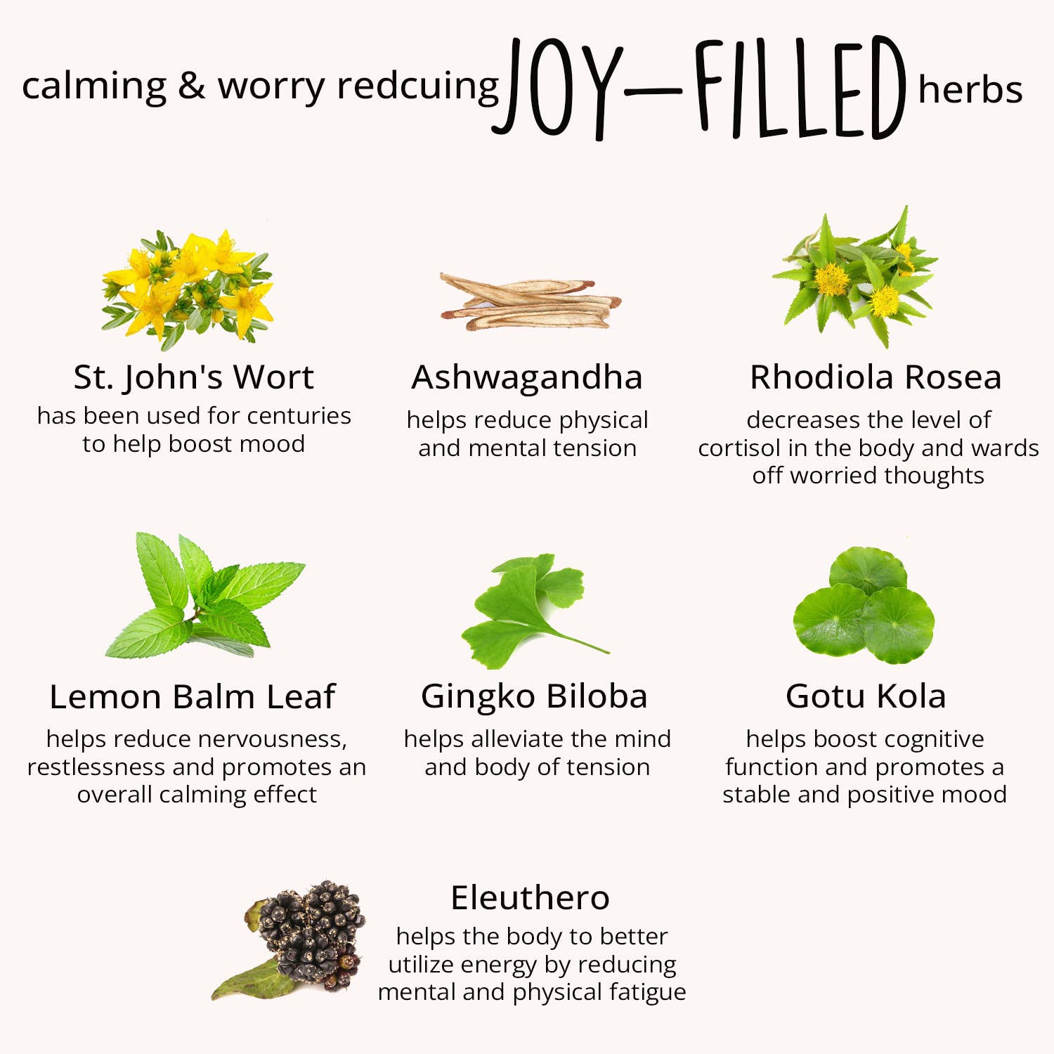 Joy-Filled is a 100% plant-based supplement that supports you by: * Relieving Daily Stress and Tension in the Mind and Body * Soothing Anxiousness and Worries * Uplifting Mood and Energy * Healing Ingredients include Ashwagandha & Ginkgo Biloba