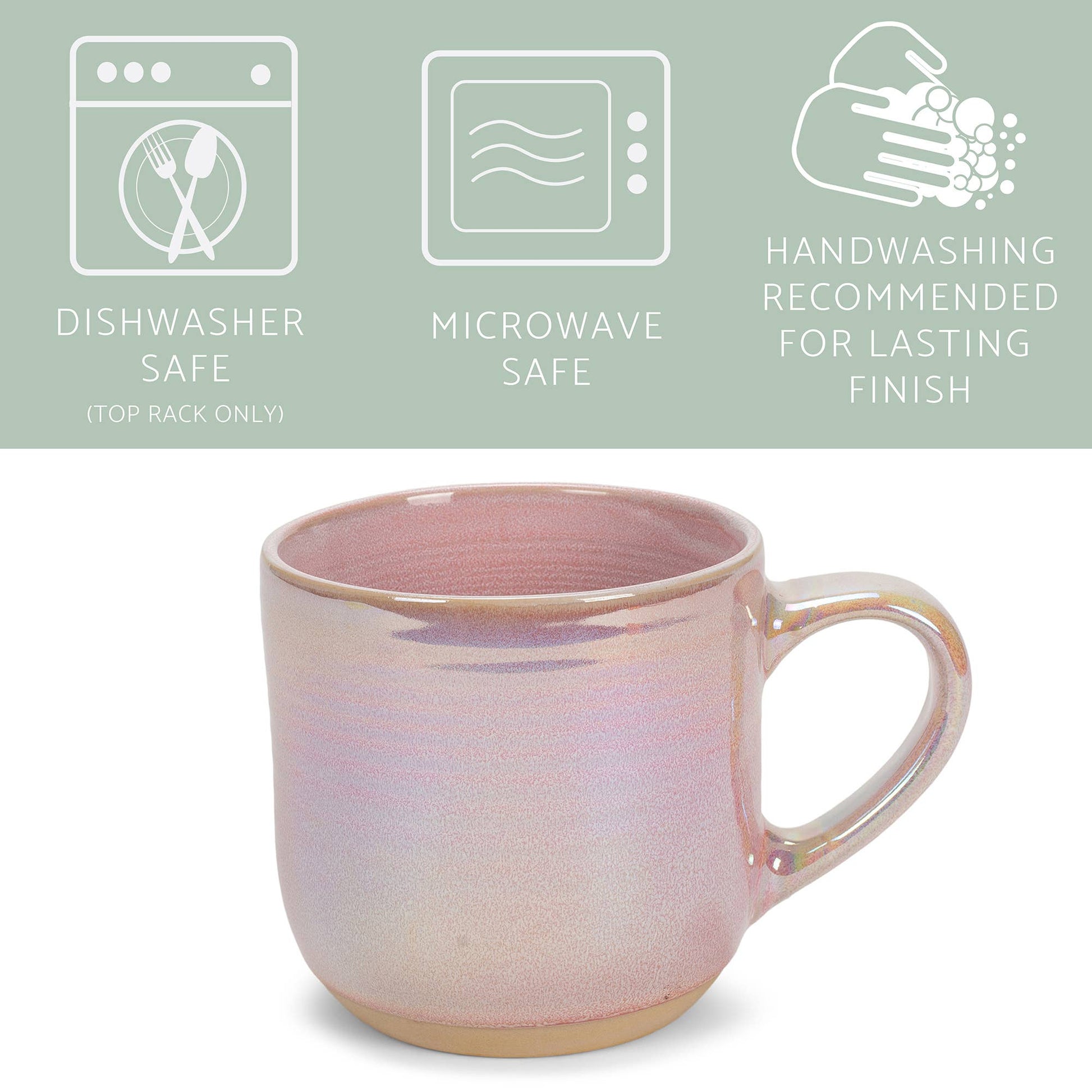 ABSOLUTELY STUNNING: Fun and vibrant color with high gloss finish shows off your personality. Add a little glamour to your drinkware or a splash of color year-round with this pretty accent cup. The use of reactive glaze creates a unique effect which means no two mugs will be alike. MODERN FARMHOUSE: Made of ceramic stoneware with a thrown pottery, handcrafted look. Each mug holds approximately 17 fluid ounces of your favorite hot or cold coffee, tea, latte, or cocoa. FUNCTIONAL & GORGEOUS: Add to your morning routine of coffee or nightly herbal tea. A large handle makes this mug comfortable to hold, which is ideal when you are sipping your drinks. EASY CLEAN UP: Top drawer dishwasher and microwave safe for no fuss and quick cleaning; Stack and store, or hang on a mug wall for decorative, beautiful display in your home café or coffee bar.